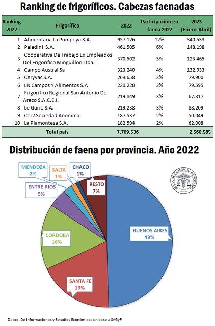 A nivel de distribución de la faena por establecimiento, el sector frigorífico se encuentra relativamente atomizado, aunque con jugadores de gran relevancia. Alimentaria La Pompeya, emplazada en la localidad bonaerense de Marcos Paz, lidera el ranking de faena, habiéndose acercado al millón de cabezas faenadas en 2022, o 12% de participación de mercado. La empresa santafesina Paladini faenó 460.000 cabezas en dicho año, ocupando el segundo lugar con un 6% del total. La Cooperativa de Ex Empleados del Frigorífico Maguillón se ubicó en tercer lugar con un total de 370.000 cerdos faenados.
