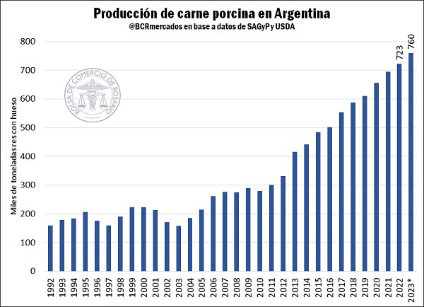 En el año 2022 se faenaron 7,7 millones de porcinos, lo que representó un récord absoluto para el país, y un incremento del 2,5% en relación con 2021. La producción total alcanzó 723.380 toneladas (res con hueso equivalente), mostrando un incremento del 4% entre años. Argentina más que duplicó su producción de carne porcina en los últimos 10 años y la multiplicó por 5 en los últimos 20 años.