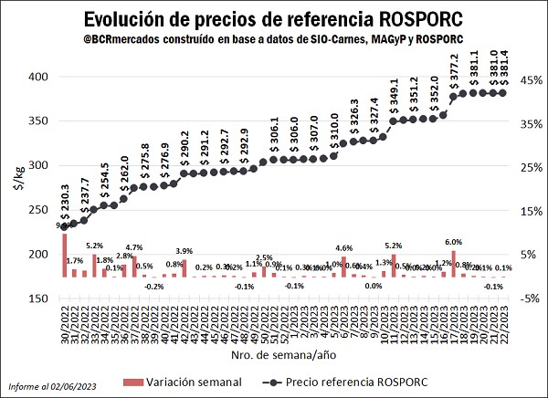 A pesar de una recomposición en el precio al productor en el mes de abril, el precio del capón continúa evolucionando por debajo de la inflación general de la economía en 2023. En el 2022, el precio del capón creció en torno a un 70% cuando la inflación acumulada medida por el IPC se ubicó en el 95%. En el comienzo de 2023 parecía que el capón podía recuperar el terreno perdido, pero continúa creciendo por debajo del nivel general de precios; hasta abril el precio del cerdo en el mercado doméstico había crecido en torno al 20% en relación con diciembre, contra un 30% de inflación en el período. El precio del Capón según el precio de referencia del Mercado ROSPORC alcanzó $ 381,4 en la semana del 22 al 28 de mayo.