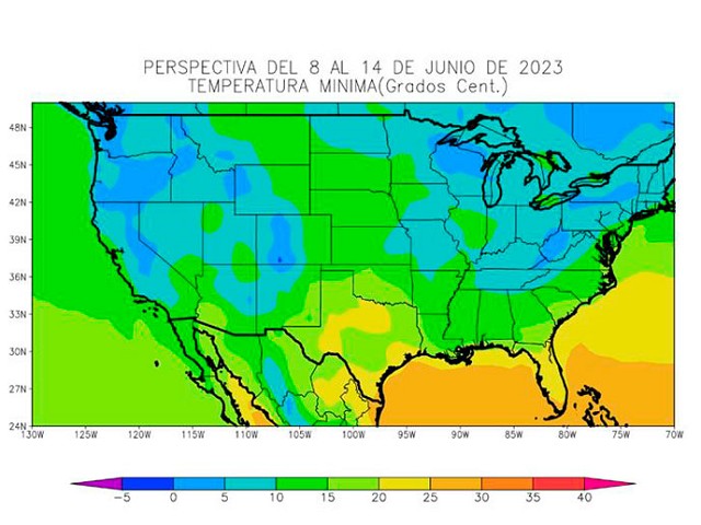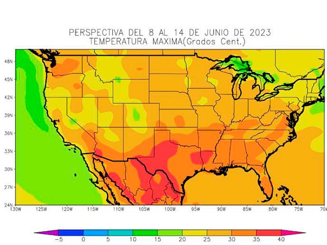 Al comienzo de la perspectiva, se observarán bajas temperaturas, causadas por la masa de aire polar, que ingresó en los días precedentes, produciendo temperaturas mínimas algo por debajo de lo normal, pero con escaso riesgo y heladas. Los vientos del trópico retornarán con moderado vigor, incrementando la temperatura con registros cercanos a superiores a lo normal en la mayor parte del área agrícola norteamericana, salvo en su extremo sur, que observará calores por encima de la media estacional. Paralelamente, se producirá el paso de un frente de tormenta, produciendo lluvias moderadas a escasas en el norte del área agrícola, y moderadas a abundantes en la mayor parte del resto de su extensión, con algunos focos de tormentas. Riesgos: Fuertes lluvias en partes de las Llanuras del Norte. 8-9 de junio; Inundaciones inminentes en partes de las Montañas Rocosas del Norte, Gran Cuenca del Norte; temperaturas muy por encima de lo normal en partes de las Montañas Rocosas del Norte y la Gran Cuenca del Norte, el jueves 8 de junio