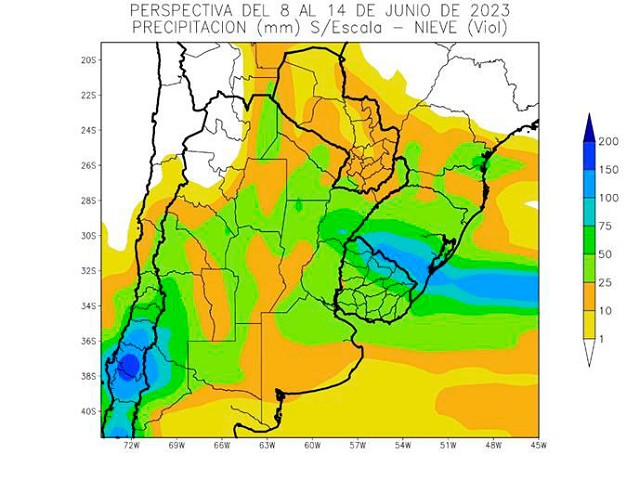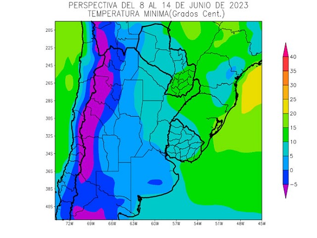 La perspectiva comenzará con vientos del trópico, pero sólo el extremo norte del área agrícola observará temperaturas elevadas, mientras que la mayor parte de su extensión continuará experimentando registros más moderados, pero algo por encima de la media estacional. Paralelamente, se producirá el paso de un frente con moderada a alta actividad, produciendo precipitaciones generales, con focos de gran actividad sobre la Cordillera Sur y el Litoral Fluvial. Paralelamente, se dará la posibilidad de nevadas sobre gran parte del sur y el centro del área agrícola, pero es muy difícil que se concreten. Junto con el paso del frente, se producirá una vigorosa irrupción de vientos polares, produciendo un abrupto descenso térmico, con riesgo de heladas generales en las zonas cordilleranas y en las serranías bonaerenses, y de heladas agronómicas en todo el sur y el centro del área agrícola.