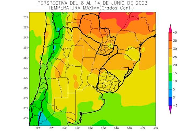 La mayor parte del área agrícola argentina y la mayor parte del área agrícola uruguaya observarán temperaturas máximas superiores a 20°C con un amplio foco con valores superiores a 25 y 30°C, que se ubicarán hacia el norte y otros focos con valores inferiores.