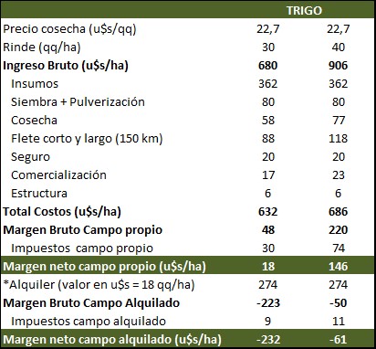 Para comenzar a ganar se requieren al menos 45 qq/ha. En campo propio la situación es otra: el rinde de indiferencia es de 29 qq/ha.
