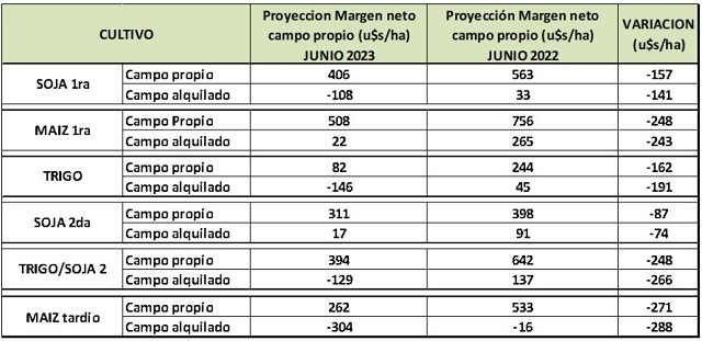 Todos los cultivos presentan una caída de sus márgenes 2023/24 frente a los del 2022/23 para esta misma fecha. Bajo la condición de campo propio, el maíz de 1ra y la rotación trigo/soja fueron los que más retrocedieron de año a año (-248 u$s/ha cada uno). En campo alquilado, el maíz tardío muestra la mayor variación negativa, con -288 u$s/ha, seguido de la rotación trigo/soja de 2da, con -266 U$s/ha.