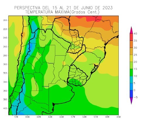 • El norte del NOA, la Región del Chaco, el centro de Cuyo, la mayor parte de la Mesopotamia, el norte de la Región Pampeana y la mayor parte del Uruguay observará temperaturas máximas superiores a 15°C, con un amplio foco con valores superiores a 25 y 30°C, que se ubicará sobre la mayor parte del Paraguay y el norte de la Mesopotamia y otros focos aislados con valores inferiores.