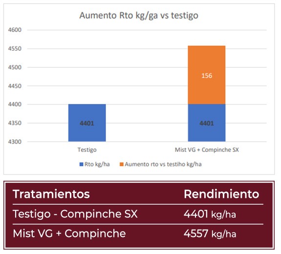 En un ensayo realizado recientemente, se comparó un testigo absoluto (T1), un tratamiento con 40 kg/ha un microgranulado convencional (T2), 40 kg/ha de B-Phos 15-35 (T3) y un tratamiento combinado en donde se utilizó 40kg/ha de b-Phos 15-35 y 500cc de Mist VG como tratamiento de semilla en trigo (T4). Los resultados demostraron un incremento diferencial de 500 Kg MS/ha del T4 con respecto al testigo absoluto y 350 kg MS/ha del tratamiento T3 con microgranulado con respecto al testigo absoluto. Estas mediciones se efectuaron a 30 días luego de la germinación. Este aumento de materia seca se traduce en una mayor aérea fotosintética, un cierre de surco anticipado y una mayor exploración radicular.