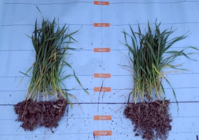 En un ensayo realizado en la localidad de 9 de julio, provincia de Buenos Aires se comparó un testigo absoluto con una semilla tratada con Mist VG. La variedad sembrada para el ensayo fue Klein Liebre el 25/06/2022, con una densidad de 160 kg/ha. Al momento de la siembra se aplicaron 140 kg/ha de mezcla (7-40-5-00-6 Ca) y en el estadio z2.3 se voleó urea con un ajuste del modelo de 180-x. El diseño empleado fue de macro franjas donde se evaluó el crecimiento radicular, obteniendo un mayor desarrollo del mismo así como el rendimiento, donde se obtuvo un diferencial de 156 kg/ha.