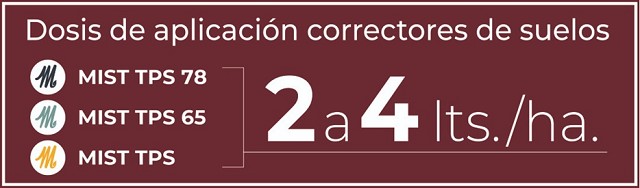 La línea MIST TPS® se compone por correctores de suelos de alta eficiencia recomendados para problemáticas de distinta naturaleza. Formulado como dispersión de nanopartículas su relación azufre / calcio / magnesio proviene de su fuente de origen. Es altamente recomendado para alcanzar el equilibrio ácido-base del suelo generando leves correcciones de pH. Por otra parte, aporta bases reponiendo calcio y magnesio al complejo de Intercambio lo cual mejora la estructura y química edáfica, además de nutrir los cultivos.