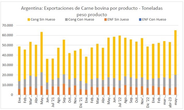 En mayo de 2023, se exportaron 44,8 mil toneladas de carne bovina congelada sin hueso, por un valor de 185,9 millones de dólares. El precio promedio de las exportaciones de carne bovina congelada sin hueso resultó de 4.146 dólares por tonelada. Como consecuencia de los abultados embarques con destino a China, los volúmenes exportados de carne congelada deshuesada crecen significativamente, con una variación de un (+22,6%) con respecto al mes precedente; y además resultan (+12,6%) superiores a los volúmenes embarcados en mayo de 2022. En los primeros cinco meses del año 2023, las exportaciones de esta partida alcanzaron las 187,7 mil toneladas; un (+13,8%) por encima de las 165,0 mil toneladas registradas entre enero y mayo de 2022. El ingreso de divisas por exportaciones de carne bovina congelada deshuesada a lo largo de los primeros cinco meses de 2023 resultó cercano a 771,3 millones de dólares; un (-20,8%) inferior a los 974,1 millones que se habían facturado entre enero y mayo de 2022.