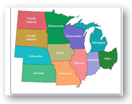 Abajo mostramos el mapa de los Estados que comprenden el Medio Oeste, a fin de comprender más cabalmente a qué partes se refieren los pronósticos.