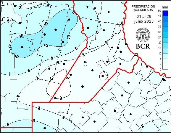 El mes se despide con temperaturas por encima de los normal, alta humedad relativa y con pronósticos de lluvias que han fallado sistemáticamente. El porqué de esto, Elorriaga lo explica diciendo esto es “debido a las escasas incursiones de aire frío desde el sur. Esta vez, predominó la circulación del sector norte, mucho más cálida y húmeda, propicia para la inestabilidad. Pero termina siendo ineficiente debido a la ausencia de una dinámica de circulación que capitalice esa humedad en lluvias”. De esta manera la región núcleo despide junio con muy poca agua. En junio suelen llover entre 10 mm en el sector oeste y 25 mm en el este. Sin embargo el promedio acumulado mensual de toda la región es de 3,5 mm. Y cómo se ve en el mapa, las localidades de córdoba son las que se quedaron con la mayor carga de agua.