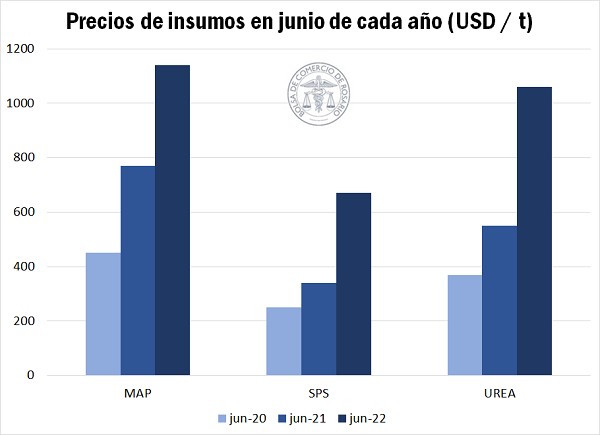 Los precios de los insumos agrícolas suelen estar estrechamente relacionados al precio de la energía, ya que esta influye directamente sobre sus costos de producción, en muchos casos, y sobre sus costos de transporte. Durante el año 2022, como resultado del comienzo de la guerra entre Rusia y Ucrania, el petróleo crudo alcanzó valores máximos desde el año 2008, y este escenario se vio reflejado en gran parte en el costo de los principales insumos. El siguiente gráfico muestra la evolución de los precios de tres insumos comúnmente utilizados en la producción de granos: el MAP (fosfato monoamónico), SPS (superfosfato simple) y urea, tomando como referencia el mes de junio de cada año. En el caso del SPS y la urea, los precios de 2022 casi duplicaron a los de 2021, mientras que el MAP aumentó un 48% interanual.