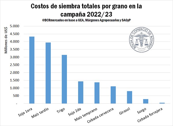 Multiplicando estos promedios por hectárea por la superficie sembrada que se estima para cada grano, basada en estimaciones propias de GEA y en la Secretaría de Agricultura, Ganadería y Pesca, se obtiene el costo total en que habrían incurrido los productores de Argentina en la campaña 2022/23, el cual asciende a US$ 16.456 millones y está compuesto por US$ 4.326 M para la soja de primera, US$ 3.948 M para el maíz tardío, US$ 3.148 M para el trigo, US$ 1.428 para la soja de segunda, US$ 1.363 para el maíz temprano, US$ 1.106 M para la cebada cervecera, US$ 803 M para el girasol, US$ 285 M para el sorgo y U$S 46 M para la cebada forrajera.