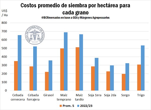 Si se compara con los costos promedios de los últimos 5 años, se observa que el costo de la siembra de cebada cervecera aumentó un 88% y la cervecera 82%, el girasol 60%, el maíz temprano 38% y el tardío 30%, la soja de primera 35% y la de segunda 31%, el sorgo 63% y el trigo 74%.