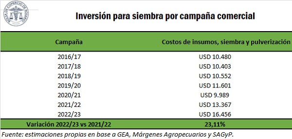 De este modo, se estima que los costos de siembra, pulverización e insumos habrían rondado los US$ 16.456 millones, siendo los más altos de, al menos, los últimos 7 años. Este importe resulta un 23% superior al de la campaña pasada, y un 47% mayor al promedio los últimos cinco ciclos agrícolas.
