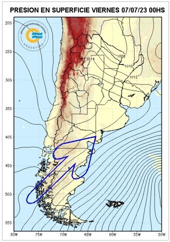 El mapa muestra la previsión de la presión en superficie para el comienzo del viernes. Si se valida esta previsión el impacto más marcado de esta llegada de aire frío se sentirá sobre el centro sur de la región pampeana, quedando la mayor parte del norte del país protegido por una circulación del sector este.