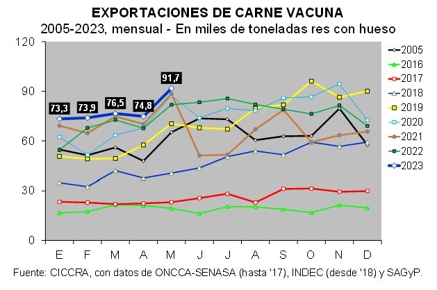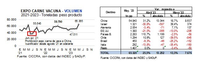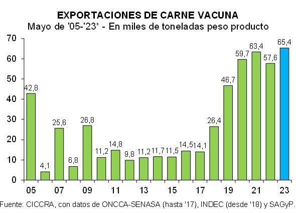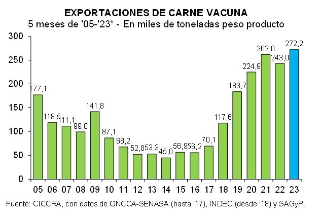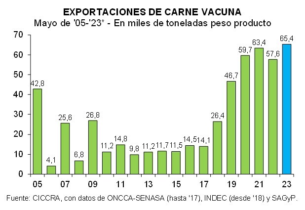 El volumen de carne vacuna exportado en mayo de 2023 fue récord para el mes y fue el tercero más elevado de la historia (detrás de nov. ’20 y oct. ’19). En tanto, el valor de la tonelada exportada bajó 7,1% y se ubicó en 4.236 dólares por tn pp.
