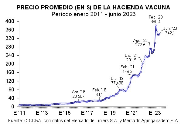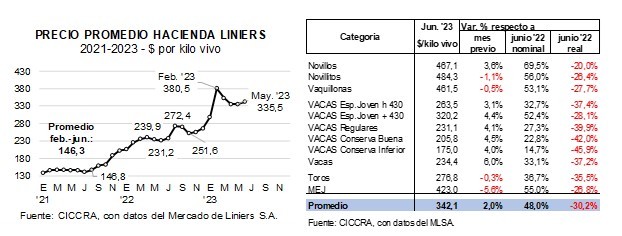 El precio promedio de la hacienda en pie negociada en el mercado de Cañuelas se ubicó en $ 342,1 por kilo vivo en el sexto mes del año. En relación a mayo, la suba de 2,0% estuvo traccionada por un aumento de 6,0% del valor de las vacas (los precios de las diferentes categorías de vacas subieron entre 3,1% y 4,5% según la categoría; en tanto, fue la mayor proporción de vacas especiales la que hizo que el precio promedio de la categoría subiera más aún).