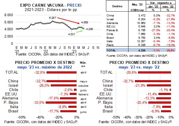 El valor de los embarques a China equivalió a 190,4 millones de dólares y representó 68,8% del total facturado. En línea con lo establecido en el párrafo anterior, entre abril y mayo los ingresos por estas ventas fueron mayores (por más volumen y precio similar) y al comparar con mayo de 2022, la facturación fue menor (por mayor volumen combinado con una fuerte caída del precio promedio de los cortes exportados).