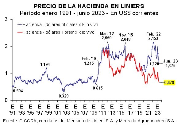 Medido en dólares, durante junio el precio del kilo vivo disminuyó tanto en el segmento oficial como libre. Mientras el valor de la hacienda subió 2,0% mensual en pesos, la cotización en pesos del tipo de cambio oficial subió 7,6% y la del dólar libre hizo lo propio en 6,1%. El precio promedio de la hacienda en pie en dólares oficiales se ubicó en 1,375 dólares por kilo vivo, es decir 5,2% por debajo del mes previo, y medido en dólares libres fue equivalente a 0,679 dólares por kilo vivo, resultando 3,9% menor al de mayo. Y en la comparación interanual, el precio de la hacienda en pie en dólares cayó 27,0% (segmento oficial) y 31,9% (segmento libre).