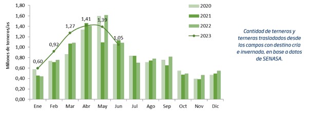De acuerdo a los datos registrados por el SENASA a través de los documentos de traslado electrónicos (DTe), en los primeros tres meses del año, la cantidad de terneros y terneras que debieron salir de los campos de cría hacia otros establecimientos de cría o invernada, alcanzaba los 2,79 millones, volumen que representaba un 22% más de lo registrado en igual trimestre del año anterior.