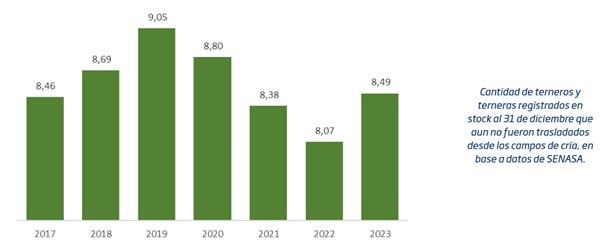 Hasta ese entonces no se conocía el número total de terneros registrados en stock al 31 de diciembre de 2022, algo que posteriormente fue confirmado en unos 15,1 millones de cabezas, 670.000 más que los contados a inicio de la anterior zafra.