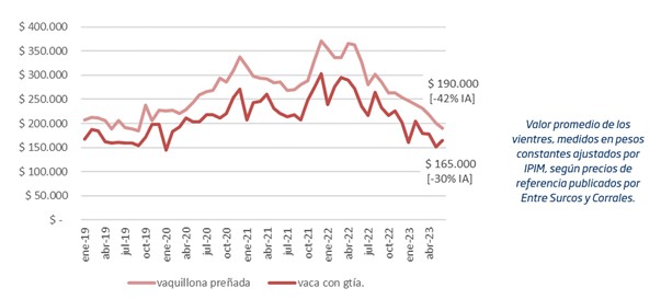 Como ya hemos mencionado en Lotes anteriores, los vientres muestran un retraso importante respecto del aumento general de precios; tanto vacas como vaquillonas preñadas que rondan actualmente los 160.000 a 190.000 pesos, respectivamente, medidos a valores de hoy registran retrasos del orden del 30 al 40% interanual.