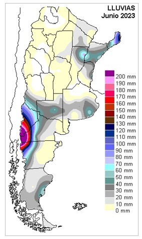 En el comienzo de julio se han sostenido las lluvias muy abundantes en el noreste de la Patagonia, alternando con nevadas fuertes, no necesariamente en la cordillera mendocina, más bien hacia el sur. Las lluvias están teniendo una respuesta satisfactoria para la cuenca del Comahue. También este comienzo de julio ha dejado lluvias exageradas en gran parte del sudeste bonaerense. En las cercanías de Balcarce y Mar del Plata, son comunes las marcas que superan los cien milímetros, un registro comparable al correspondiente a todo el invierno. Más hacia la zona interior del sudeste, las marcas se ubican entre treinta y cincuenta, es decir, en una semana se han completado los valores normales. Claramente es una zona que deberá lidiar con suelos saturados en el invierno. Por estas horas las lluvias se han trasladado hacia la zona central del país, con guarismos variados, en general unos veinte milímetros en el norte de LP, norte de BA y sur de SF.