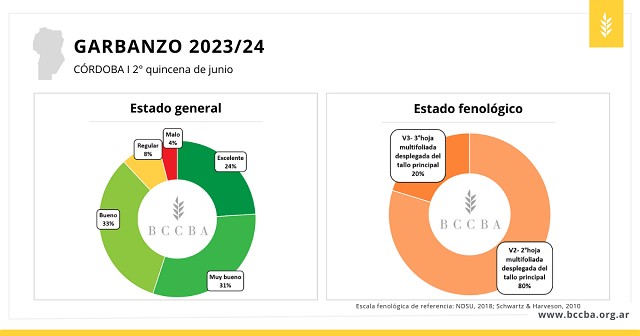 En junio concluyó la siembra de las hectáreas proyectadas de garbanzo y el cultivo presentaba de 2 a 3 hojas. El 88 % de los lotes se encontraba entre excelente y buen estado, mientras que el 12 % regular y malo debido a leves daños por heladas.