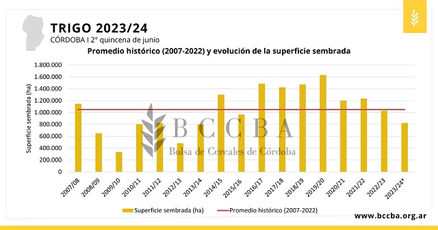 En junio se realizó una nueva estimación de la proyección de siembra de trigo en Córdoba. La misma indica que se sembrarían 824.900 hectáreas con el cereal y sería la menor superficie desde la campaña 2013/14, donde fueron sembradas 802 mil.