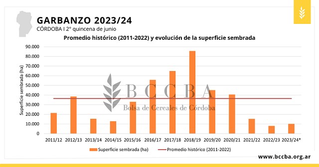 Para la campaña 2023/24 se estima que serían sembradas 10.100 hectáreas con garbanzo, aumentando un 27 % respecto el año pasado. Si se compara con la superficie promedio histórica sembrada en Córdoba, la variación es negativa en un 72 %.