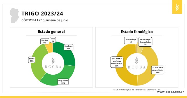 El cereal atravesaba su estado vegetativo con dos o más hojas desarrolladas y, en algunos lotes, comenzaba a macollar. En general, el cultivo presentaba muy buenas condiciones y, respecto a la presencia de plagas y enfermedades, fue reportado el pulgón verde de los cereales (Schizapis graminum) con baja presencia y mancha amarilla (Drechslera tritici-repentis) también en bajos niveles.