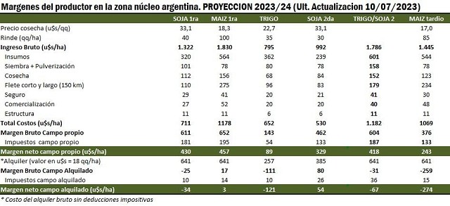 Con los precios actualizados a este jueves 10 de julio, los márgenes calculados siguen arrojando los mejores números para el maíz de primera en campo propio con 457 u$s/ha.