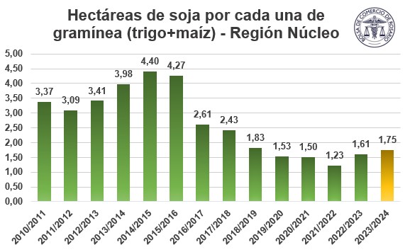 El año pasado había intenciones de sembrarse 5 M ha con soja, pero por la falta de agua a la siembra quedaron fuera 400.000 ha; solo se implantaron 4,6 M ha. Este año hay intenciones de recuperar parte de esas hectáreas que quedaron afuera y la oleaginosa tendrá un aumento del área del 7%, recuperando unas 300.000 has. La superficie sembrada de soja 2023/24 se estima en 4,9 M ha. Si bien en los últimos dos años se observa un aumento del área sojera en la región respecto del de gramíneas (el año pasado hubo un crecimiento importante: de sembrarse 1,23 lotes de soja por cada lote de gramíneas en 2021/22, se pasó a sembrar 1,61 lotes de soja por cada lote de gramíneas en 2022/23), en este año, el productor intenta mantener las gramíneas en la rotación y el salto respecto al año pasado no sería tan abrupto como se pensaba hace unos meses atrás. Con todos estos datos es posible calcular que en el ciclo 2023/24, por cada lote sembrado con trigo y maíz se sembrarán 1,75 de soja.