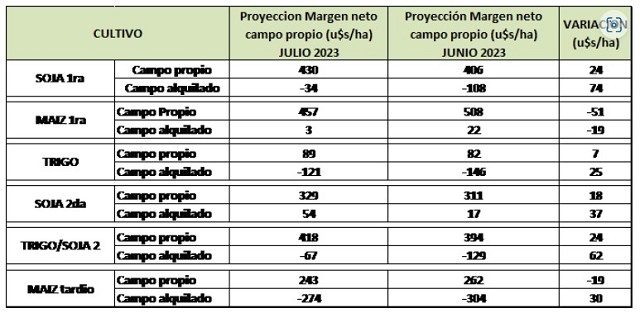 El maíz de primera fue el cultivo con el mayor descuento intermensual. La mayor caída se dio bajo la condición de campo propio con -51 U$s/ha. Contrariamente, la soja de primera en campo alquilado fue la que presentó el mayor aumento en la rentabilidad, con una mejora de 74 U$s/ha en campo alquilado y 24 u$s/ha en campo propio. Sin embargo, los márgenes siguen mostrando valores negativos teniendo en cuenta el nivel de productividad planteado (40 qq/ha) y el esquema de costo analizado.
