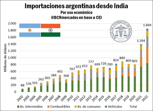 En 2022 la India se destacó como el quinto destino de las exportaciones argentinas, siendo destino del 5,2% de la canasta exportadora nacional. Al mismo tiempo, fue el séptimo origen de importaciones hacia nuestro país, agrupando el 2,3% del total importado.