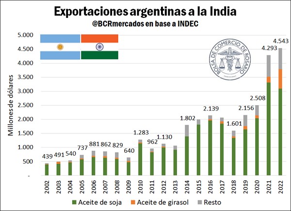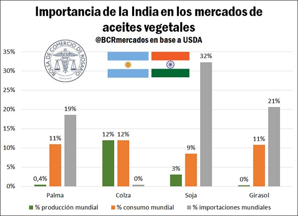 Esto toma especial preponderancia, en tanto Argentina es el principal exportador mundial de aceite de soja y el tercer exportador global de aceite de girasol. La India es un mercado estratégico a nivel mundial para los aceites vegetales. Si bien tiene un relativo autoabastecimiento para su consumo interno de colza, depende de importaciones en lo relativo a aceites de soja, girasol y palma. Una de cada 5 toneladas de aceite de palma y de aceite de girasol a nivel global tienen por destino final a la India. Más aún, casi 1 de cada 3 toneladas de aceite de soja que se comercializan en el mundo tienen a la India de comprador.