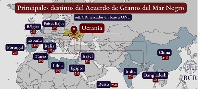 Con el corredor de granos seguro en funcionamiento, en los últimos 365 días se exportaron más de 32 millones de toneladas de granos desde los puertos ucranianos, de los cuales la mitad (51%) corresponde a maíz y 27% a trigo. Naturalmente, el primer y principal impacto en precios internacionales se debe buscar en estos dos cultivos.