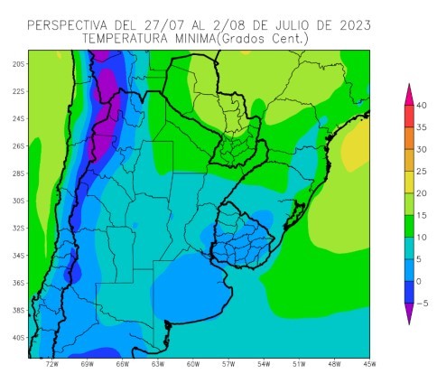 • El este del NOA, la mayor parte de Corrientes, el este de Cuyo, la mayor parte de la Región Pampeana y el noroeste del Uruguay observarán temperaturas mínimas superiores a 5°C, con riesgo de heladas localizadas, con un amplio foco con valores superiores a 10 y 15°C sobre el norte y otros focos con valores inferiores. • El centro del NOA, la mayor parte de Cuyo y gran parte de la Provincia de Buenos Aires observarán temperaturas mínimas superiores a 0°C, con riesgo de heladas localizadas. • Las áreas serranas y cordilleranas observarán temperaturas mínimas inferiores a 0°C, con focos de -5°C con riesgo de heladas generales