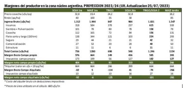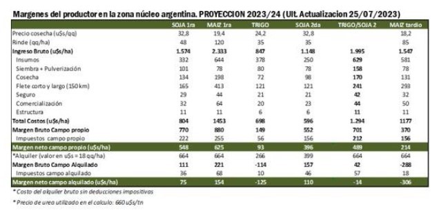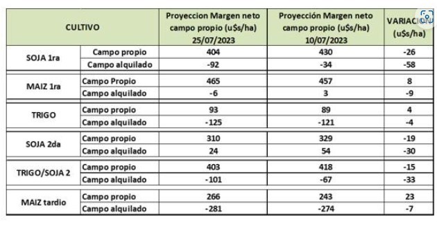Todos los márgenes son más negativos que hace 15 días para campo alquilado. El que más cayó fue el de la soja de primera con -58 u$s/ha. Los cereales, tanto maíz como trigo, fueron los que experimentaron el menor descenso debido a la evolución positiva del precio de los granos. Incluso, en campo propio presentaron una mejoría positiva en su rentabilidad.