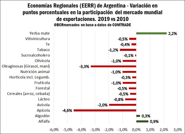 Más allá de la competitividad que tiene el sector agroindustrial en nuestro país, casi todos los productos regionales han perdido participación en el mercado mundial desde el año 2010 a la actualidad. Esto quiere decir que, Argentina se queda atrás en competitividad y pierde importancia en las exportaciones de estos productos. Es decir, esto refuerza la idea de la necesidad de políticas que apoyen la producción y agregado de valor para no quedar poco a poco relegados en un mercado internacional muy competitivo que no es estático y necesita de permanentes acciones tendientes a no perder posiciones en el mercado mundial.