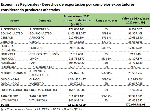 Para 2022 realizaron exportaciones por US $10.067 millones entre el conjunto de sectores, con un 65% de dicho valor exportado afectado por alguna alícuota de Derechos de Exportación. Se estima una detracción de retenciones por un monto de US$ 470 millones en base a los datos de exportación de 2022, que equivale a un aporte en recaudación de 0,074 % en relación al Producto Interno Bruto.
