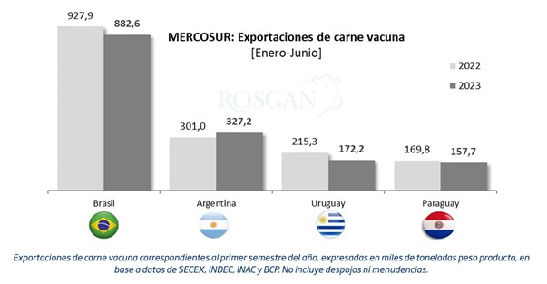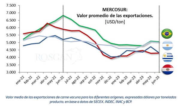 Distinto es el caso de Uruguay donde el precio de la hacienda se encuentra relativamente más firme lo que ha estado restando algo de competitividad a la exportación en los últimos meses. Según los datos del Instituto Nacional de Carnes (INAC), durante el primer semestre el valor medio de la tonelada esportada fue de USD 4.409, 14% menos que lo conseguido un año atrás. En tanto que, en volumen las ventas al exterior del primer semestre sumaron unas 172 mil toneladas, lo que representa una caída del 20% interanual.