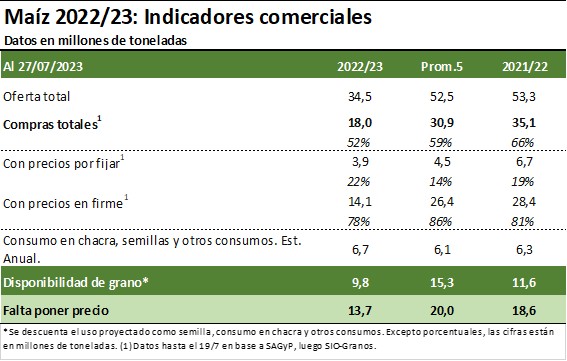 En términos del volumen de mercadería que restaría por comercializarse en la campaña, podríamos estar hablando de un universo en torno a 9,8 millones de toneladas de maíz disponible para ingresar al mercado; mientras que, sumando lo que se lleva vendido, pero aún no se ha fijado precio, estaríamos ante volumen cercano a 13,7 millones de toneladas del cereal. Si bien en términos de la oferta total, el volumen de ventas continúa mostrándose atrasado en relación con los promedios, el menor volumen producido en la campaña dada la sequía genera que el remanente en mercado se ubique marcadamente por debajo de los promedios.
