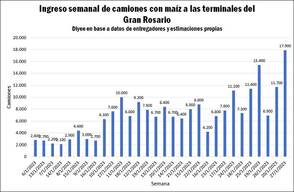 El avance comercial en plena cosecha tiene como correlato un mayor ingreso de mercadería a plantas, lo que comienza a presionar la logística del Up-River del Gran Rosario. Esta fue la semana de mayor ingreso de maíz a plantas en lo que va de 2023: entre lunes y viernes ingresaron a las terminales del Up-River un total cercano a los 17.900 camiones portando maíz, según nuestras estimaciones, el mayor registro en lo que va de 2023 y un incremento del 50% en la última semana.