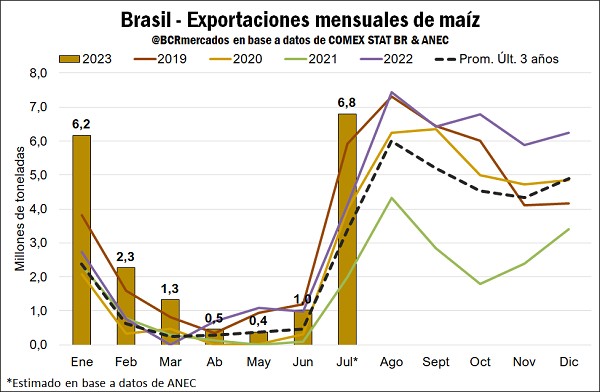 En cuanto a las exportaciones, ANEC estima 6,8 Mt de exportaciones para el mes de julio, un incremento importante que dejaría un récord de envíos al exterior para ese mes en caso de cumplirse. Con la apertura del mercado chino, Brasil seguirá dominando el mercado internacional del cereal.