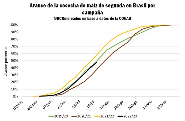 La CONAB informó un avance del 47,9% en la cosecha del maíz de segunda en Brasil, 11,7 puntos porcentuales por detrás del año pasado. Se espera una cosecha récord de maíz safriña este año con consultoras estimando nada menos que 105 millones de toneladas, mercadería que está comenzando a entrar con fuerza en el mercado actualmente. En el estado de Mato Grosso (MT) se registra un atraso de 10 puntos porcentuales, aunque avanzando con más rapidez en las últimas semanas. Según datos de CONAB, la productividad media se ha mantenido por encima de 6.000 kg/ha con buena calidad de los granos.