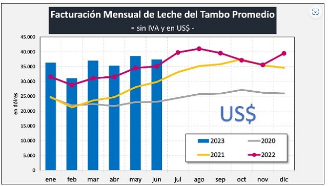 «La variación acumulada del primer semestre del año en pesos fue del +1,9%, resultante de un incremento de la producción del tambo promedio SIGLeA del 4,0% y un menor precio del 2,1%. En dólares el incremento de la facturación del 12,0% proviene del incremento en la producción mencionado (+4,0%) y de un mayor precio en dólares (oficiales mayoristas BCRA) del 7,7%», explicó el Observatorio de la Cadena Láctea en un informe.