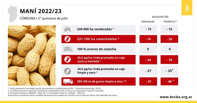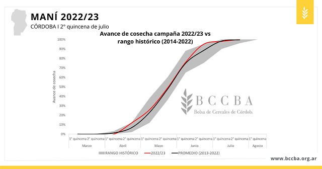 El progreso de cosecha de maní en Córdoba se dio dentro de los rangos históricos y, durante la segunda quincena de julio, se terminaron de cosechar los lotes de la oleaginosa.