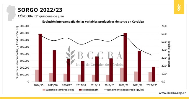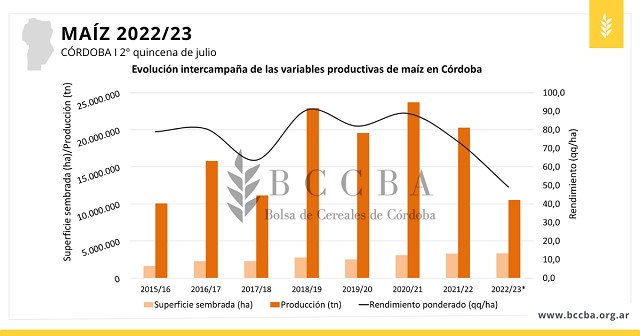 El rendimiento promedio provincial estimado para el cereal es de 49,2 qq/ha, encontrándose 25 quintales por debajo tanto del rendimiento promedio histórico en Córdoba como del logrado en la campaña anterior. Este rinde sumado a las pérdidas de superficie, repercute en la producción de grano de maíz que resultaría en 10,5 millones de toneladas, alrededor de la mitad de lo producido en la campaña 2021/22.